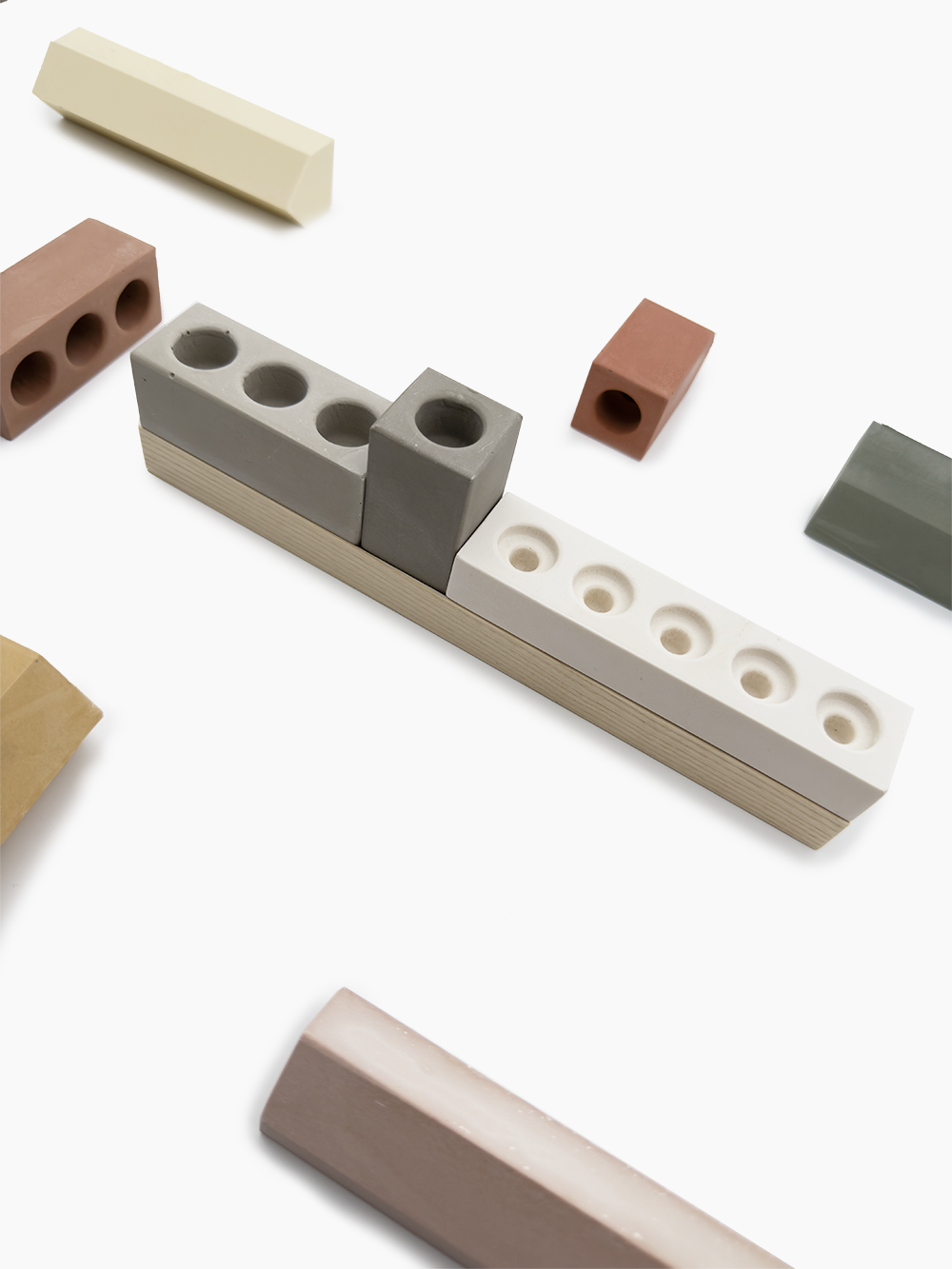 It consists of three concrete modules placed on a solid wooden base that unites them together.